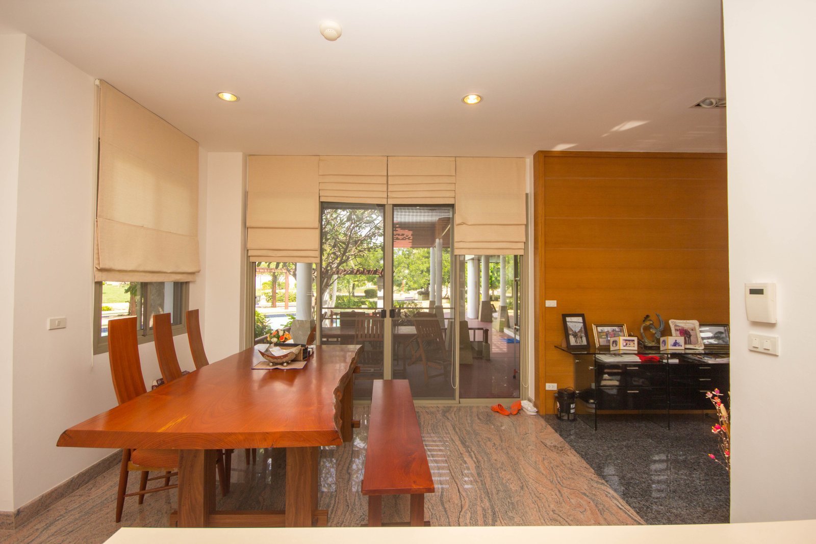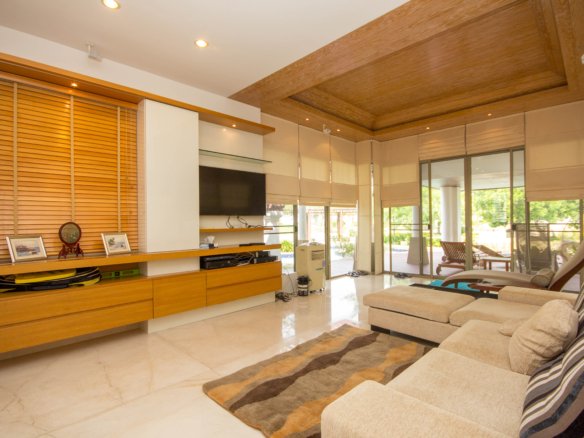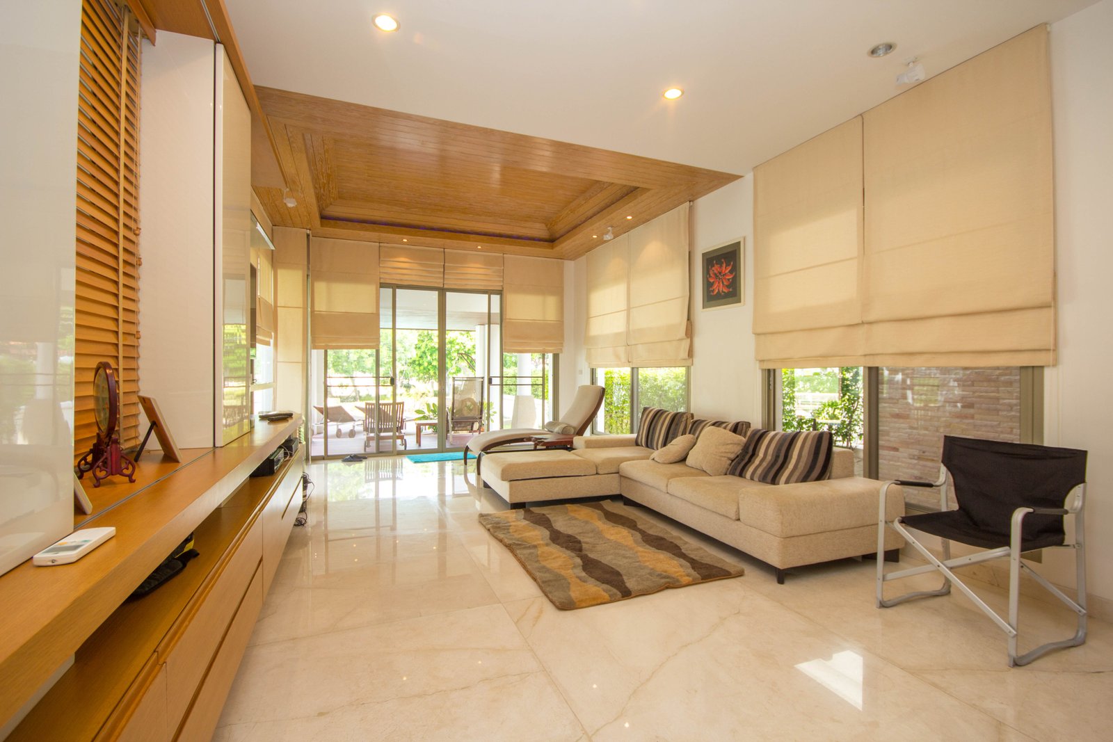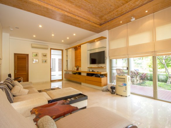 The living spaces feel open and airy thanks to floor-to-ceiling sliding glass doors that lead out to spacious patios and covered outdoor sitting areas. These spaces are perfect for enjoying the tropical gardens and mature trees, giving the home a private, calm atmosphere. The traditional clay tile roof with ornate details adds character, while the wooden flooring and wood-paneled ceiling inside bring warmth and a minimalist modern style together.