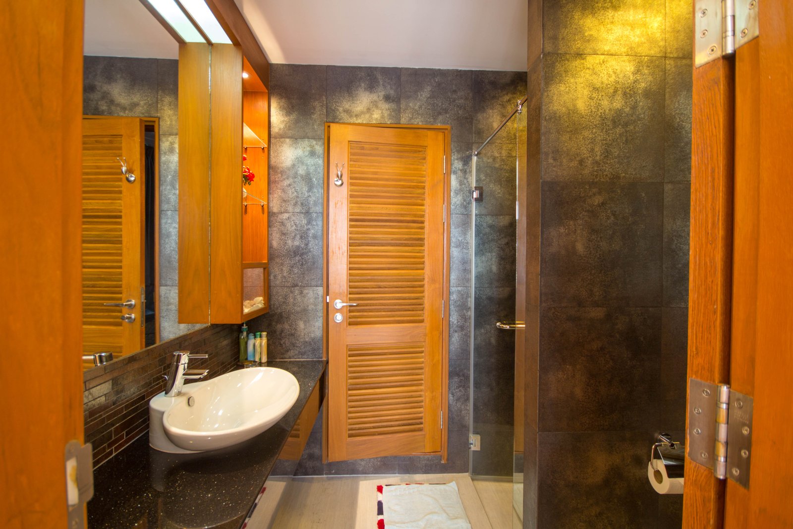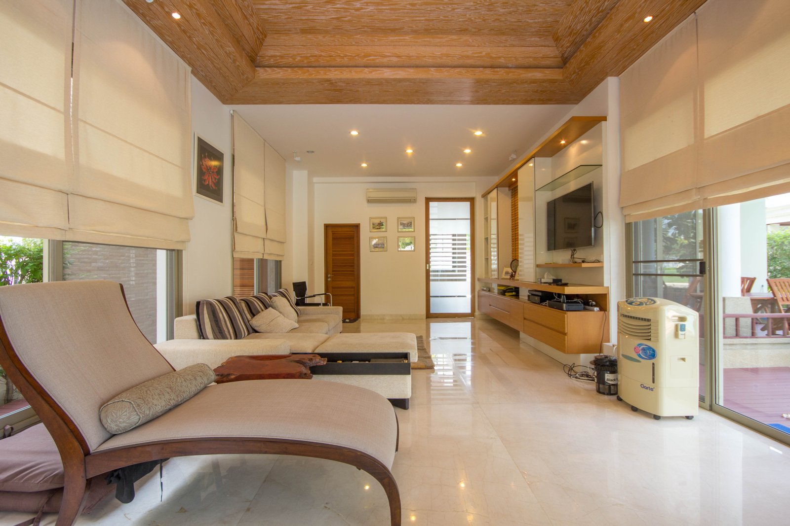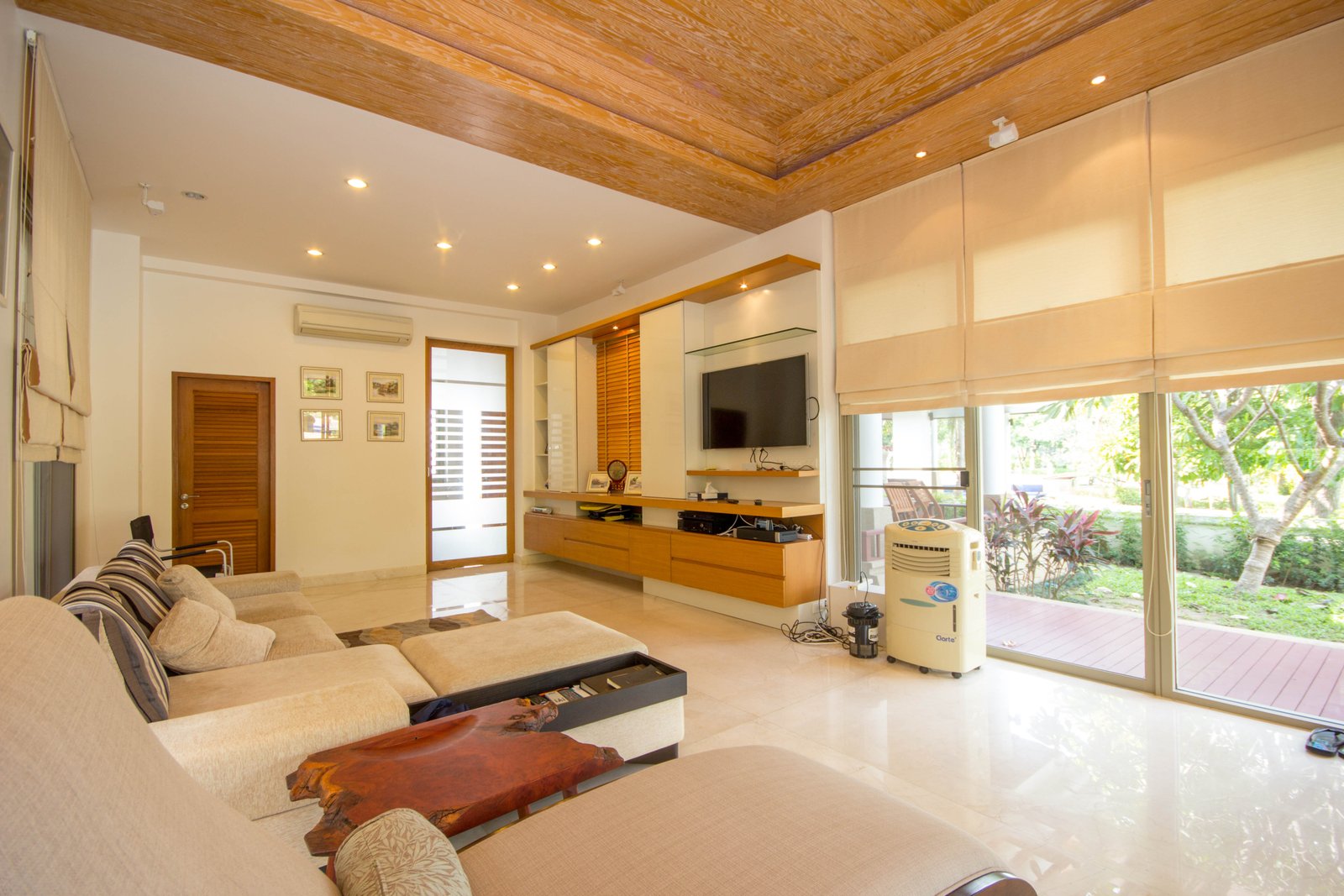 The living spaces feel open and airy thanks to floor-to-ceiling sliding glass doors that lead out to spacious patios and covered outdoor sitting areas. These spaces are perfect for enjoying the tropical gardens and mature trees, giving the home a private, calm atmosphere. The traditional clay tile roof with ornate details adds character, while the wooden flooring and wood-paneled ceiling inside bring warmth and a minimalist modern style together.