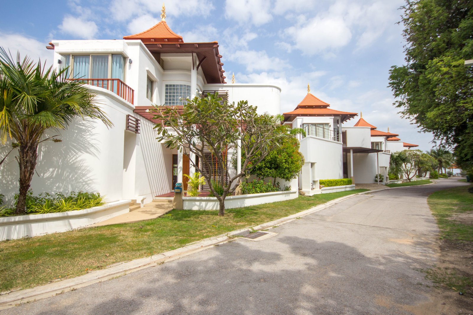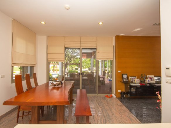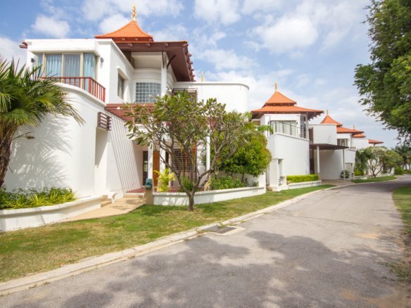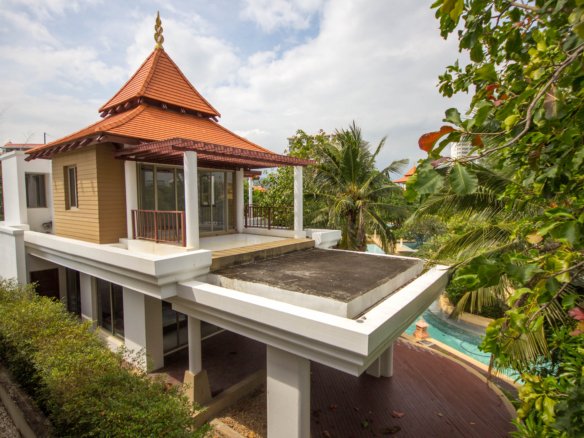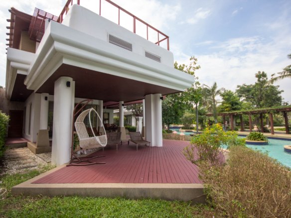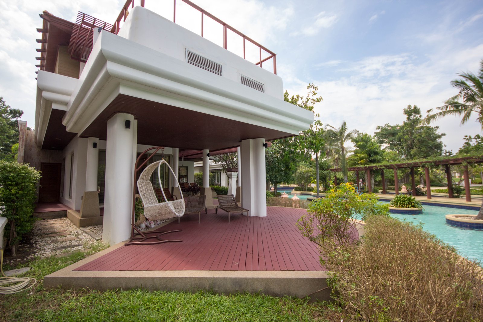 Your Peaceful Getaway in Cha-Am This house really blends traditional Thai charm with a comfortable, modern vibe. It’s spread over two floors, with three bedrooms and three bathrooms—so plenty of space for a family or guests. One thing you’ll notice right away is the large water feature out front, almost like a lagoon, surrounded by island planters with palm trees and lush greenery. It sets a tranquil tone from the moment you arrive. Thoughtful Layout