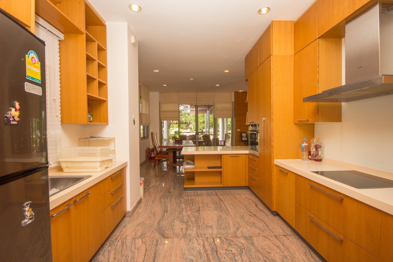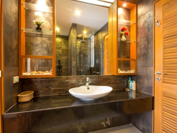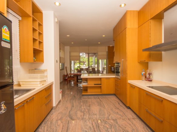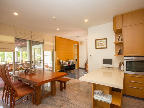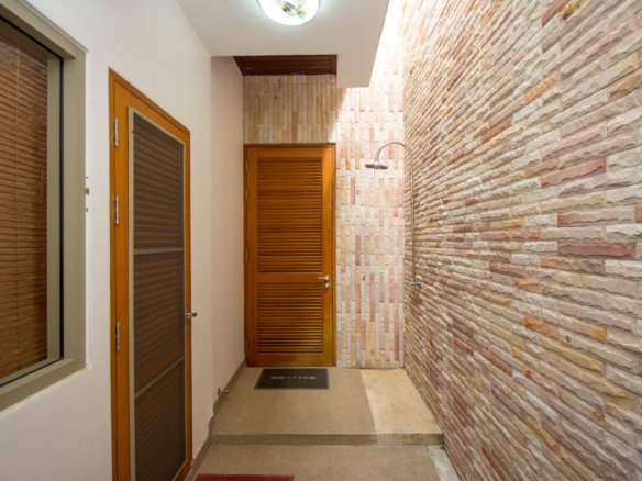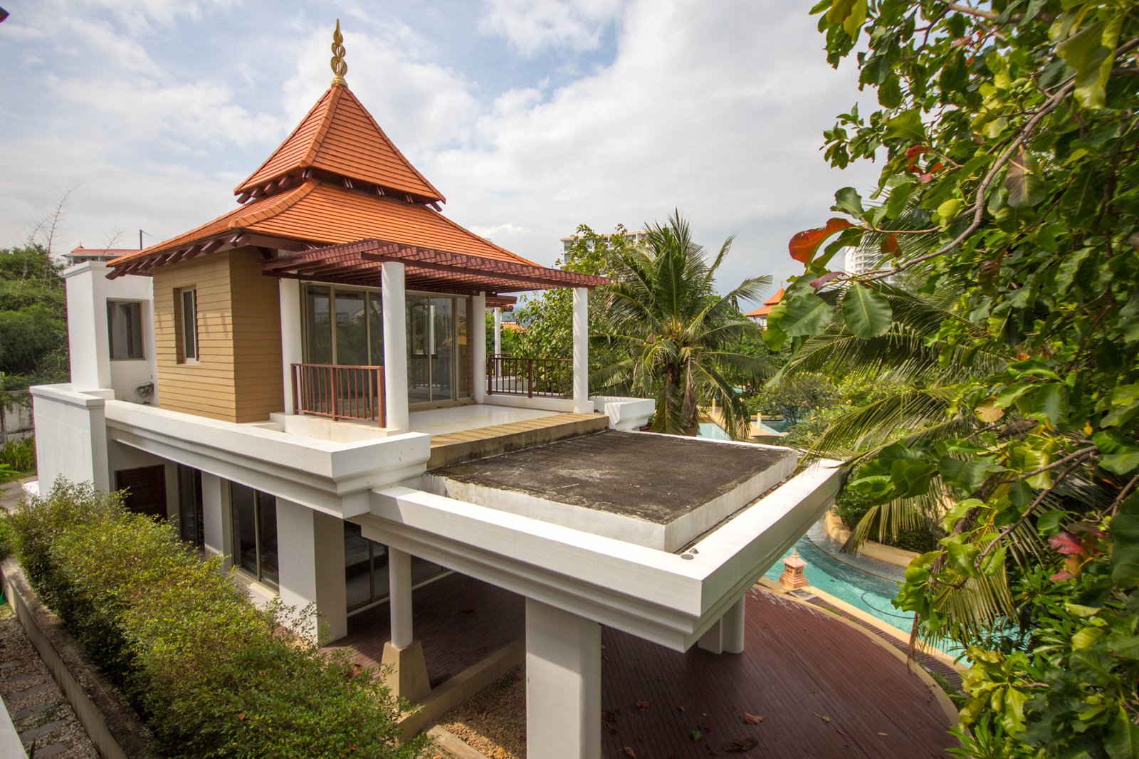 Your Peaceful Getaway in Cha-Am This house really blends traditional Thai charm with a comfortable, modern vibe. It’s spread over two floors, with three bedrooms and three bathrooms—so plenty of space for a family or guests. One thing you’ll notice right away is the large water feature out front, almost like a lagoon, surrounded by island planters with palm trees and lush greenery. It sets a tranquil tone from the moment you arrive. Thoughtful Layout