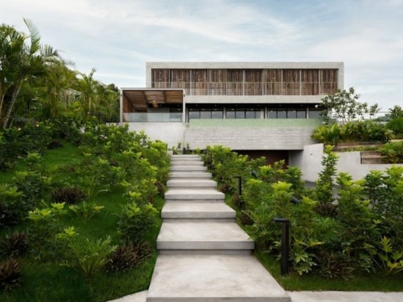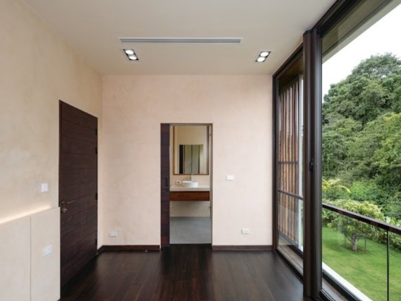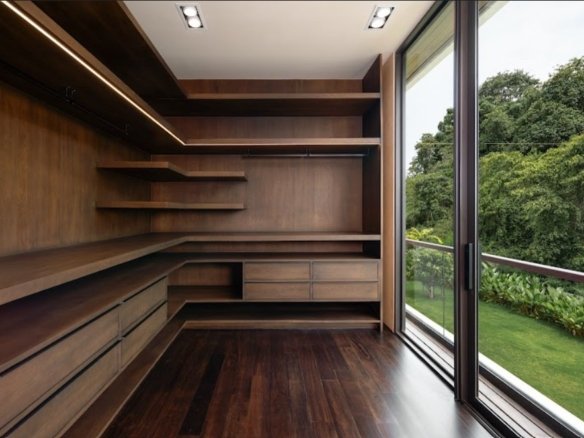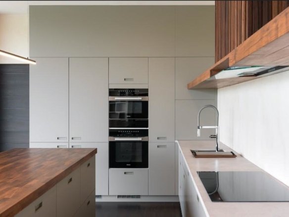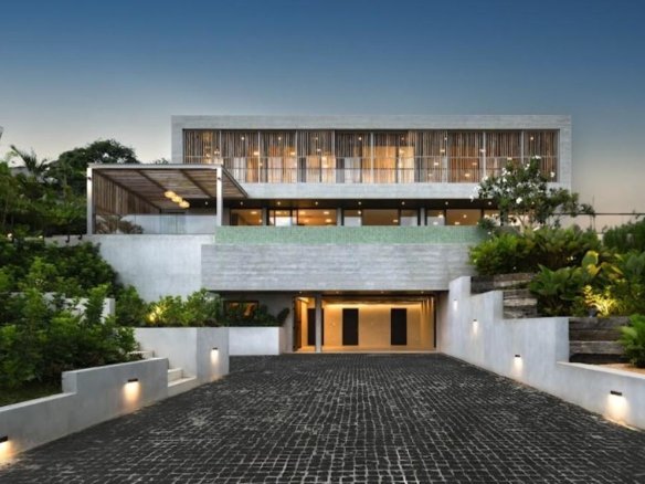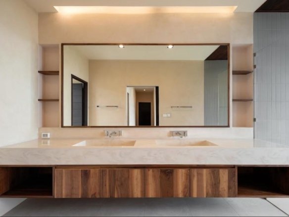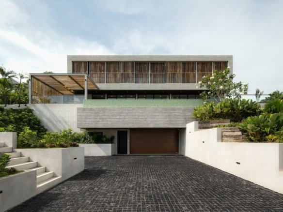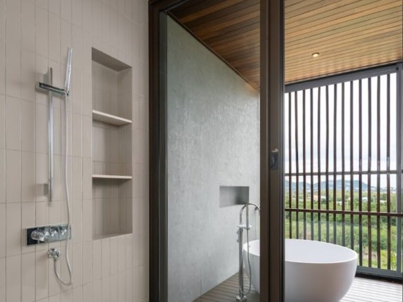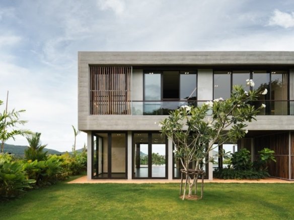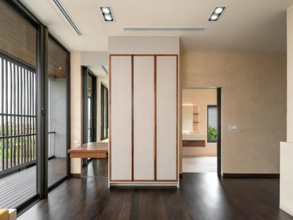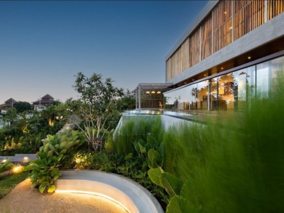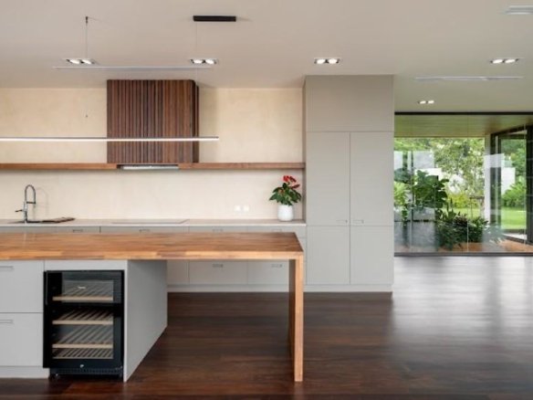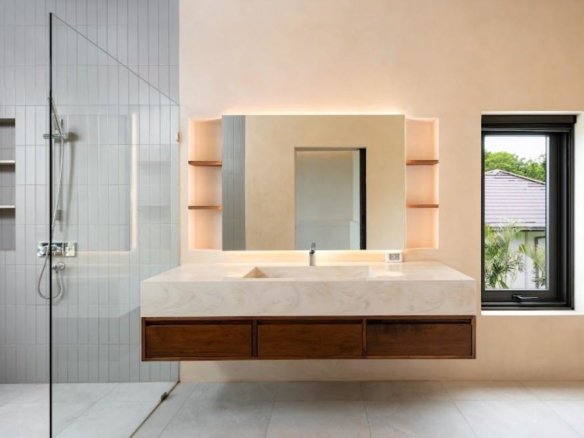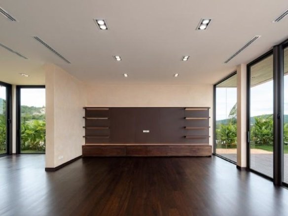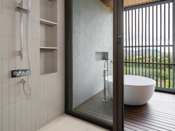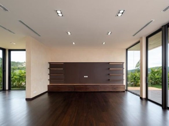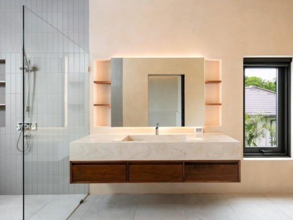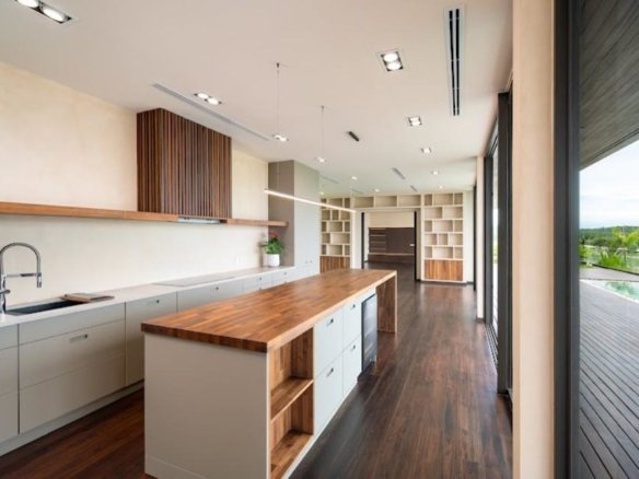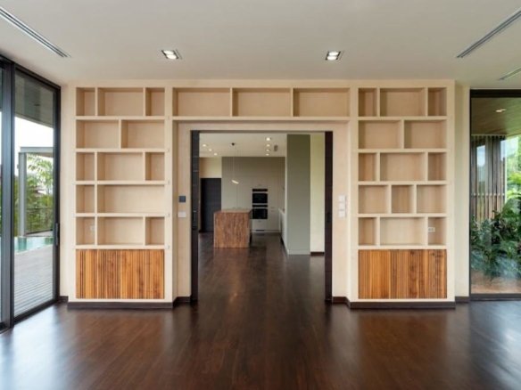 At about 720 sqm inside on a generous 1,612 sqm lot, this villa is all about blending indoor comfort with outdoor living. The layout is open and practical—you’ll probably spend a lot of time gathered around the kitchen island, which comes with a built-in wine fridge and sleek wood finishes. It flows effortlessly to the living area where large sliding glass doors open to a big balcony overlooking greenery, letting in plenty of natural light through floor-to-ceiling windows.