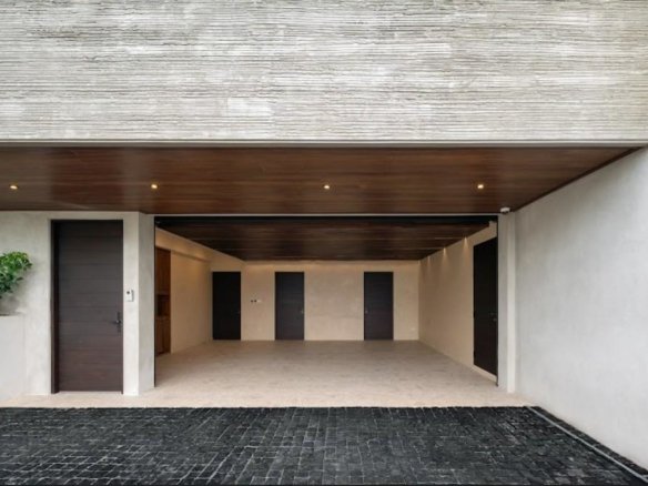 Four bedrooms and five bathrooms give you plenty of space and privacy, and the bathrooms stand out with their contemporary showers, floating vanities with double sinks, and clean, minimalist finishes. The dark hardwood floors throughout add warmth and contrast beautifully with the neutral, minimalist palette and the wooden shelving that’s integrated all over.